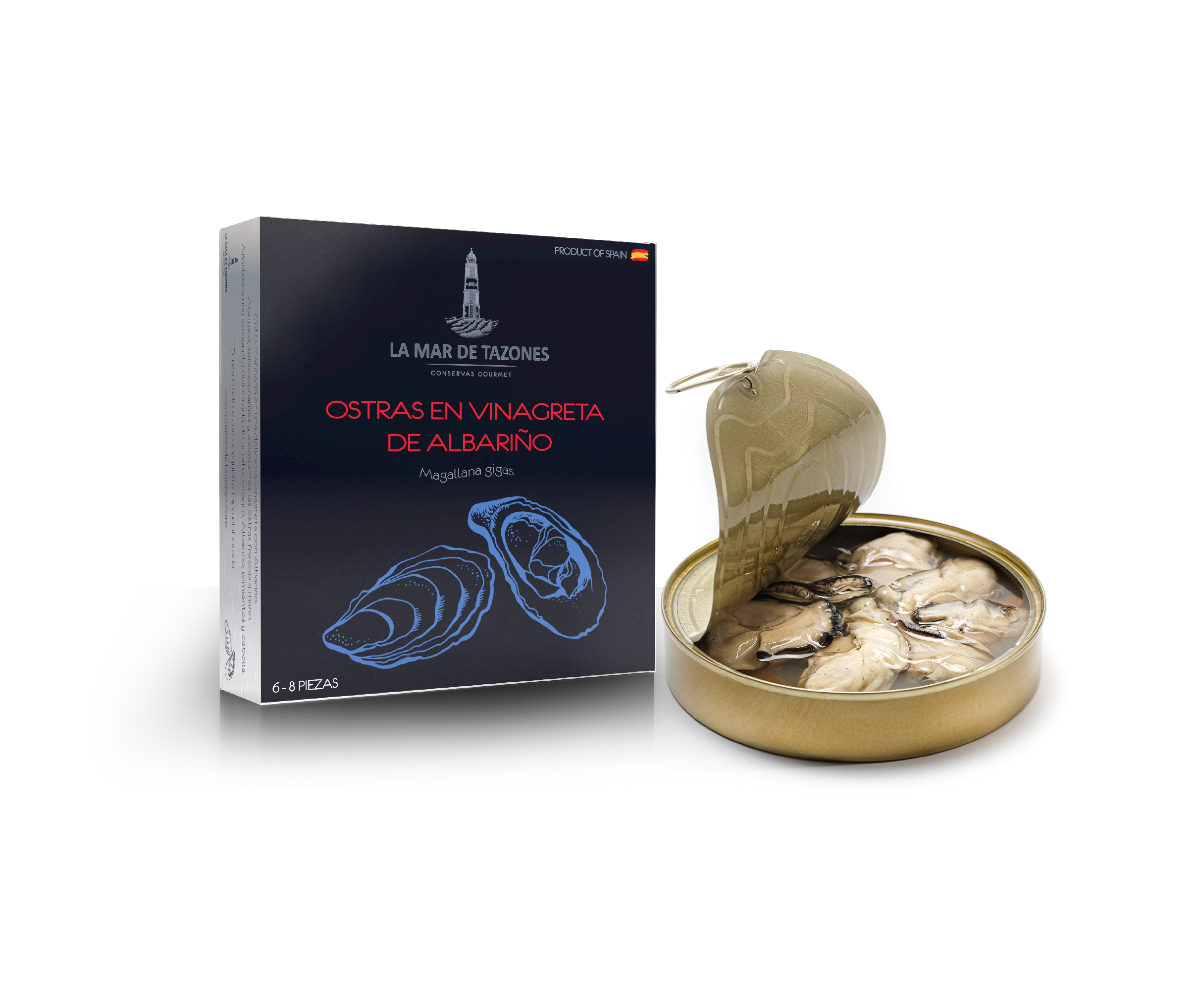Ostras en vinagreta de albariño. Ostras marinadas en una deliciosa vinagreta de albariño. Abrimos, seleccionamos y colocamos las ostras frescas a mano. Añadimos una vinagreta elaborada con aceite, vinagre, vino albariño, pimientos y cebolla.